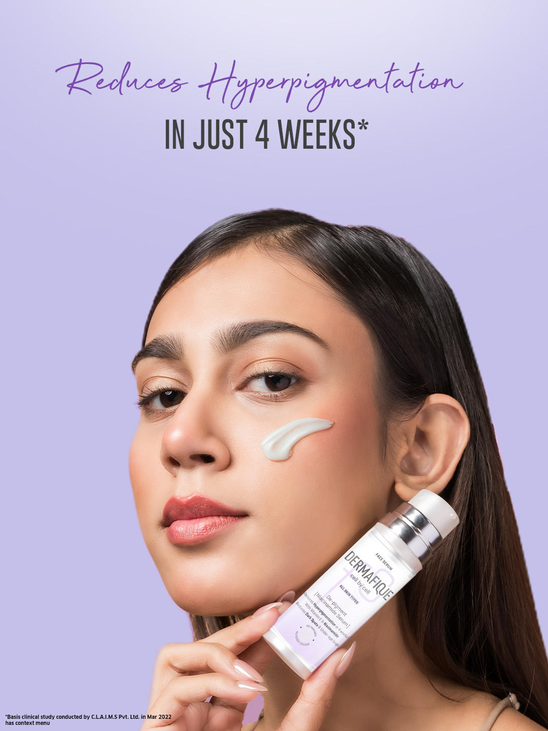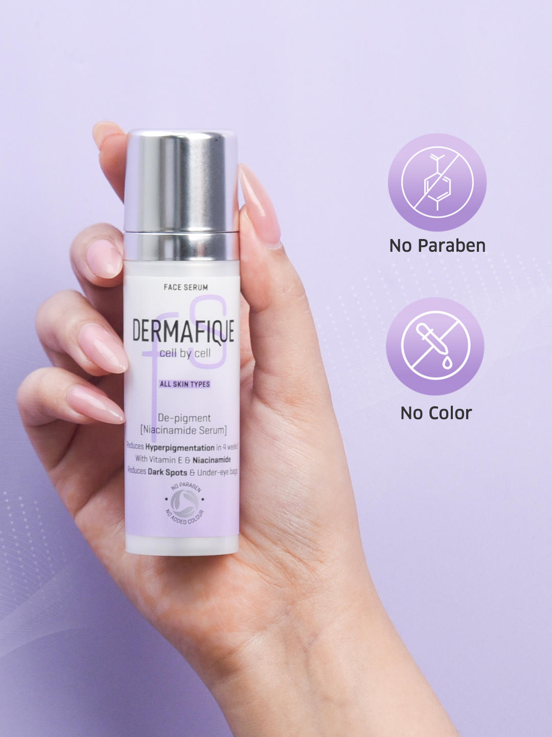 <div class="Description-main">  <img class="img-responsive" src="https://cdn.shopify.com/s/files/1/0650/7986/9645/files/de_pig_A_Frame_1.jpg?v=1745845004"> <img class="img-responsive" src="https://cdn.shopify.com/s/files/1/0650/7986/9645/files/de_pig_A_Frame_2.jpg?v=1745845004"> <img class="img-responsive" src="https://cdn.shopify.com/s/files/1/0650/7986/9645/files/de_pig_A_Frame_3.jpg?v=1745845004"> <img class="img-responsive" src="https://cdn.shopify.com/s/files/1/0650/7986/9645/files/de_pig_A_Frame_4.jpg?v=1745845004">  <img class="img-responsive" src="https://cdn.shopify.com/s/files/1/0650/7986/9645/files/de_pig_A_Frame_5.jpg?v=1745845004">  <p>Looking for a serum that reduces hyperpigmentation? Look no further than the Dermafique De-Pigment [Niacinamide Serum]. This clinically proven serum is expertly formulated to reduce hyperpigmentation in just 4 weeks*. It is enriched with Niacinamide & Vitamin E, which helps reduce pigmentation and provide even skin tone. </p><p></p> <p>This Serum also helps reduce dark spots and under-eye bags providing a radiant even toned skin. It is suitable for all skin types & contains the goodness o fGlycerin, which helps in skin hydration and renews damaged skin. It is paraben-free and contains no added color.</p><p></p> <p>Need an expert solution to reduce hyperpigmentation? Trust the Dermafique De-Pigment [Niacinamide Serum], your go-to solution for tackling pigmentation. For effective results, use it twice daily to get radiant-looking skin. </p><p></p> <i><p>*Basis clinical study conducted by C.L.A.I.M.S Pvt. Ltd. in Mar 2022.</p></i> </ul></div> <div class="Description-last" style="display: none;"> <i><p>Marketed By: ITC Ltd., Virginia House, 37 J.L. Nehru Road, Kolkata - 700 071</p> <p>Manufactured By:</p> <p>1. ITC Limited Plot No. 1, sector 11, IIE Ranipur, Haridwar, Uttrakhand - 249403</p> <p>2. ITC Limited, Manpura, Baddi Solan, Himachal Pradesh - 174101</p> <p>Country of Origin: India</p></i> </div> <div class="disc-view-btn"> <button class="more btn">Read more</button> </div>